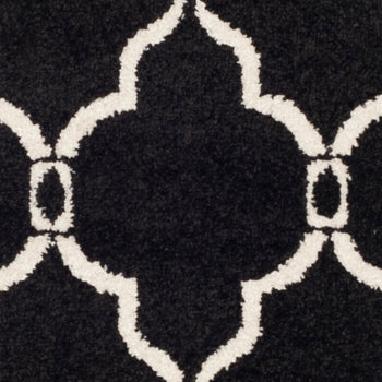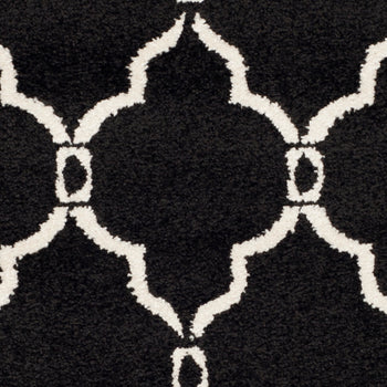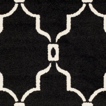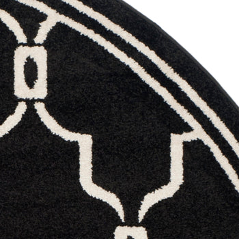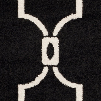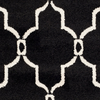 The rug features a classic pattern with bold, interconnected geometric motifs that create an eye-catching effect on the floor. Each design element is crisply defined against the deep anthracite background, making it a focal point in any room.