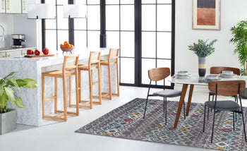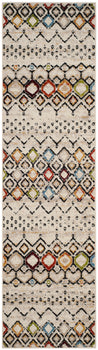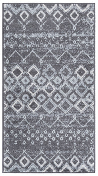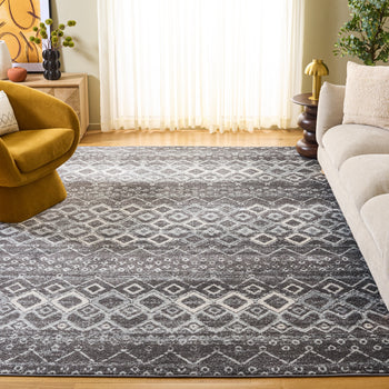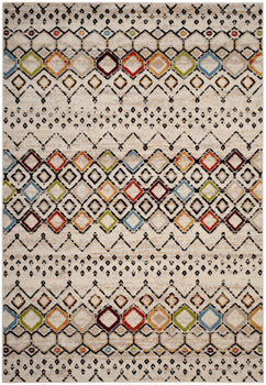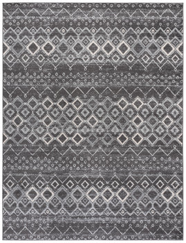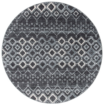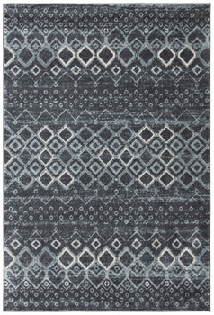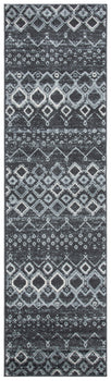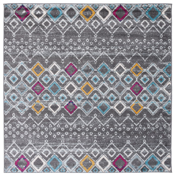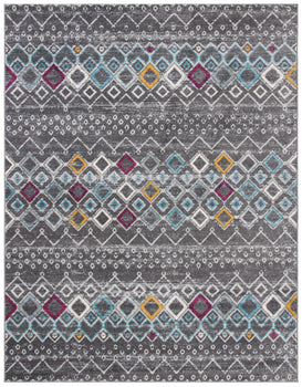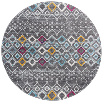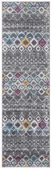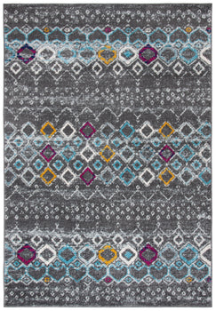 The dark grey and ivory color palette serves as a sophisticated backdrop for the vibrant diamond motifs, which are beautifully enhanced with pops of bold colors that bring the intricate bohemian pattern to life. At a comfortable height of 1/4", it's perfect for high-traffic areas, marrying style and practicality.