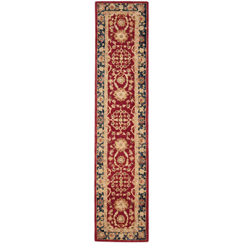 The rich red and navy palette exudes a classic charm, while its intricate patterns, taken directly from the image, showcase a harmonious medley of motifs that pay homage to the artistic heritage of rug making. Ideal for long corridors or as a striking accent in your living space, this runner's aesthetic is both versatile and captivating.