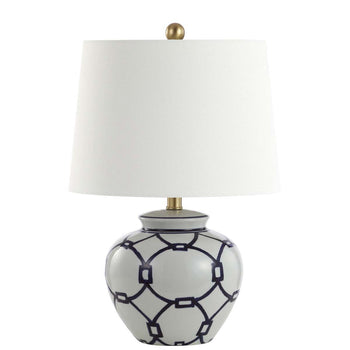Add distinction to any living room with this intricate table lamp. Crafted of ceramic, it features a lovely blue geometric pattern that graces the soft white curves. Designers love its deluxe brass gold finish and complementary off white cotton shade.