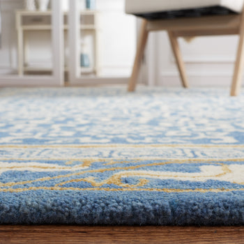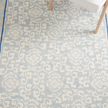 The rug features a delicate pattern, reminiscent of timeless designs with a fresh color palette that breathes new life into classic motifs. Ornate floral and vine elements grace the borders, drawing the eye towards the serene ivory field, intricately woven with subtle, ornamental illustrations in a soothing light blue hue.