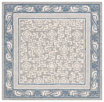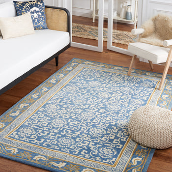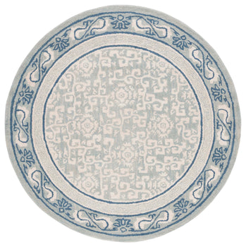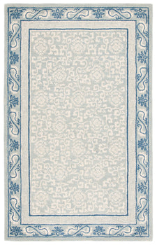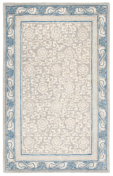 The rug features a delicate pattern, reminiscent of timeless designs with a fresh color palette that breathes new life into classic motifs. Ornate floral and vine elements grace the borders, drawing the eye towards the serene ivory field, intricately woven with subtle, ornamental illustrations in a soothing light blue hue.