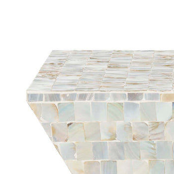 Alive with the energy and poise of modern sculpture, this contemporary square mosaic stool adds instant luxury to any living room. Crafted with shimmering faux motherofpearl in multiple shades of blue, designers use it as a side table or extra seat.