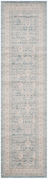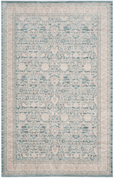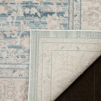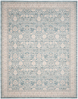The rug's enchanting pattern exudes a timeless charm, featuring intricate floral and geometric motifs that are symmetrically spread across the surface, framed by a beautifully detailed border. The harmonious blue and grey tones create a serene visual experience that seamlessly integrates with a variety of decor themes, from contemporary to traditional.
