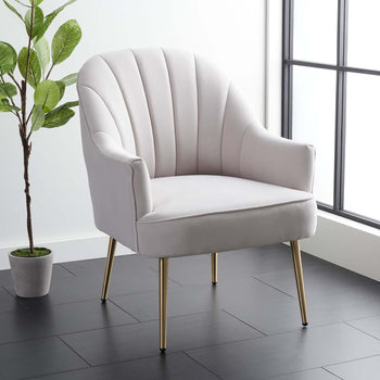 A vintage classic reimagined for today's chic interiors, this Areli Accent Chair is the epitome of elegance. Areli's Art Deco inspiration is beautifully displayed in channel-tufted cream velvet that perfectly enhances its dramatically contoured silhouette, while tapered gold metal legs give a glimmering, glamorous touch.