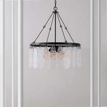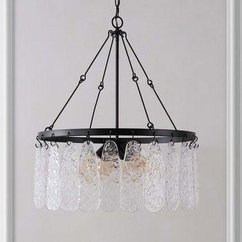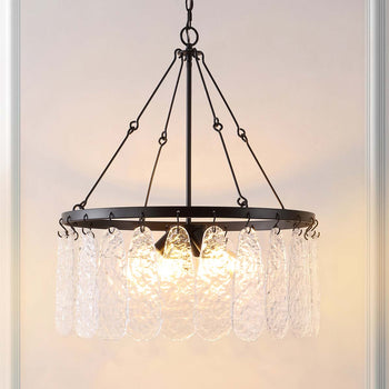Make a dramatic style statement with our Aremythia chandelier. It molds the elegance of traditional fixtures into charming and versatile chandelier. A large black iron ring supported by four chains to attain a well-loved farmhouse feel. It hangs several tear-shaped glass crystals to deliver sparkling glamour to any room. Our chandelier includes six bulbs to beautifully illuminate a large dining table, living space, or entryway.