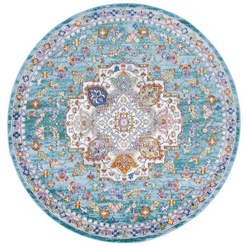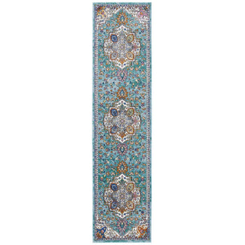 Elevate your living space with the essence of elegance and cultural charm with our 4' X 6' turquoise and ivory small rectangle area rug. Beautifully constructed using a state-of-the-art power loomed technique, this rug offers a uniform and precise pattern, featuring an intricate transitional style that gracefully bridges the gap between traditional and contemporary decor.