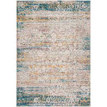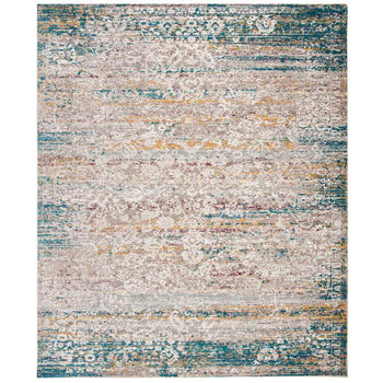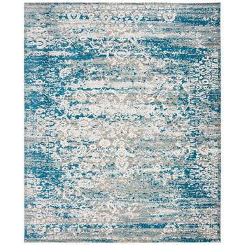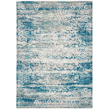 Featuring a serene palette of blue and cream, the rug's design harmoniously intertwines traditional patterns with contemporary fades and distressing, creating a stunning visual that complements a variety of decors. The intricate design depicted in the image showcases a balanced mix of ornate details and abstract elements, resulting in a versatile piece that is as functional as it is aesthetically appealing.