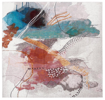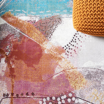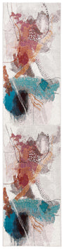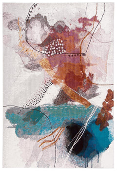 Featuring an abstract expressionist design, this rug showcases a harmonious blend of colors and shapes that invite visual intrigue and aesthetic appeal to any room. The striking contrasts and fluid transitions between shades of ivory, red, and bold accents create a focal point that can anchor your furniture and decor, inspiring an atmosphere of creativity and charm.