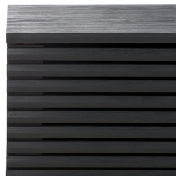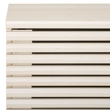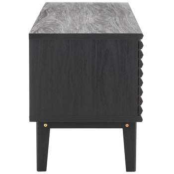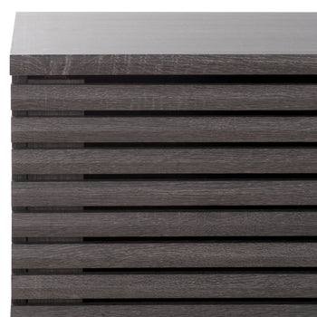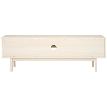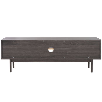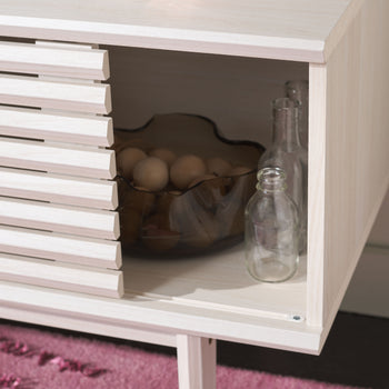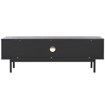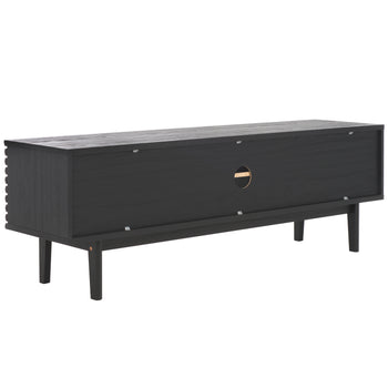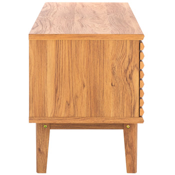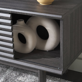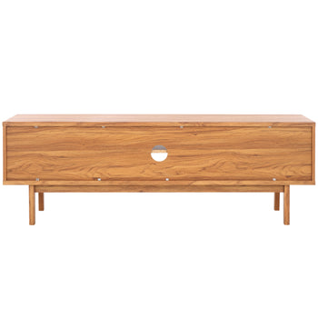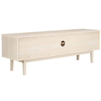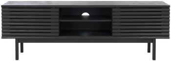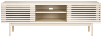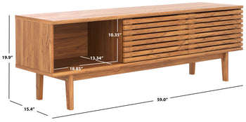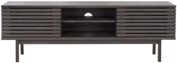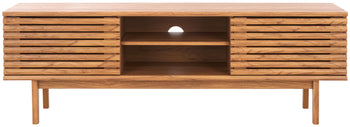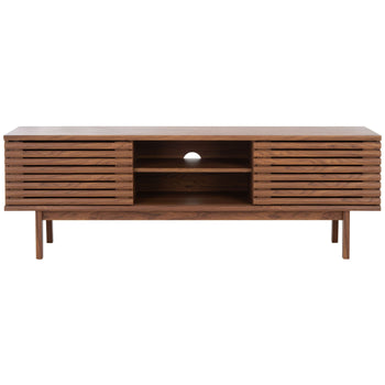 Step up the style and functionality of your living space with our Aricia media stand. The streamlined profile and sleek design details make our media stand as a charming and welcoming addition to any corner. A slatted facade adds definition and charm to our airy and linear storage unit. It highlights the natural grains of wood in a rich finish. Featuring two open shelves and roomy cabinets, our media console provides ample storage to complement and allow your large television set to take center stage.