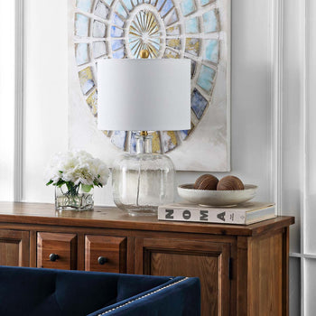 Updating the classic urn shape for today's contemporary interiors, this Armena Table Lamp is effortlessly elegant. Armena's clear seeded glass casts an artistic, intriguing glow when struck by light, and its white drum shade and gold finished hardware ensure it blends with any Decor.
