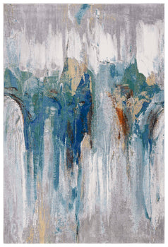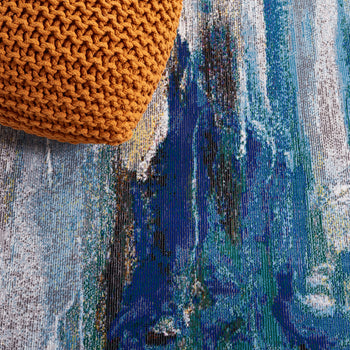 The rug showcases a contemporary abstract pattern, featuring elegant light grey and blue hues that seamlessly blend into your existing decor, creating a serene and inviting atmosphere. The intricate design captured in the image is a testament to the rug's power-loomed precision, offering a balance of artistry and consistency in every stitch.