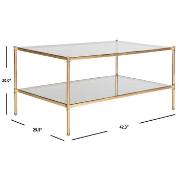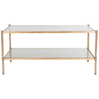A refined design that embraces both classic and transitional styling, this two tiered Aslan Coffee Table provides ample space for collectibles, drinks, and hors d'seuvres. Crafted of glass and iron with antique gold leaf finish for elegant interiors.