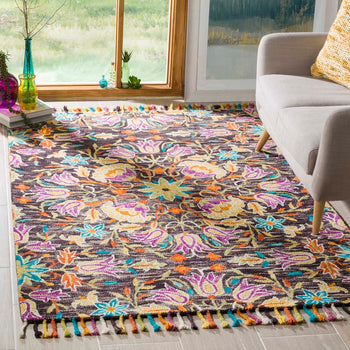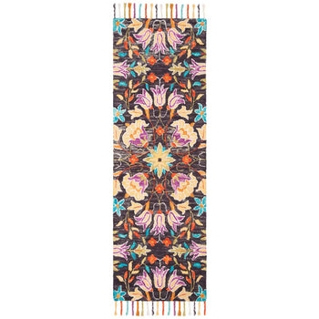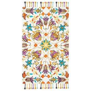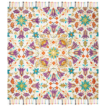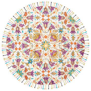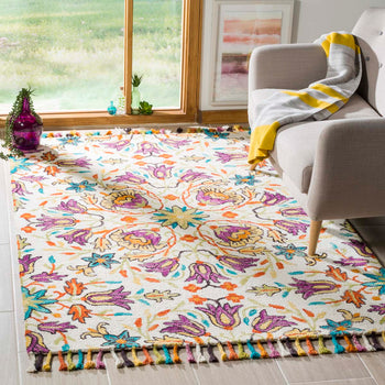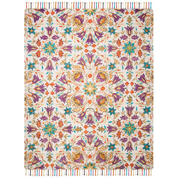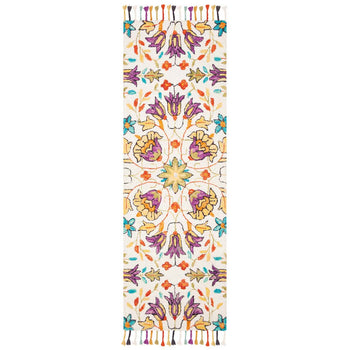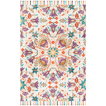 The harmonious blend of ivory and purple hues sets the stage for a delightful floral and geometric pattern that captivates the eye. Each design element interweaves with organic finesse, creating a symphony of color and form that resonates with both contemporary and traditional decor.