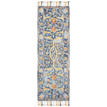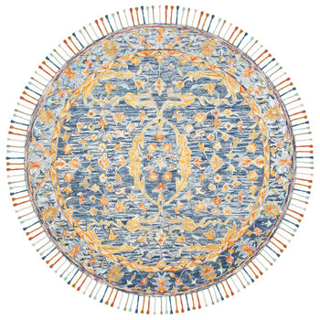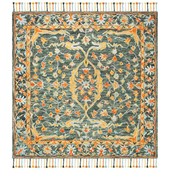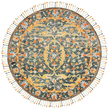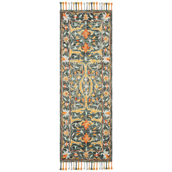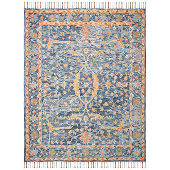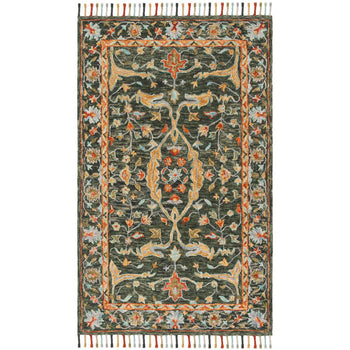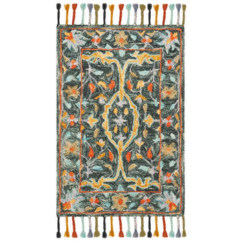 Crafted with care in India, this wool rug showcases a timeless design, embodying a harmonious blend of floral and geometric patterns that create an inviting and sophisticated ambiance. The striking central medallion is framed by intricate borders, with complementary corner pieces adding to the rug's overall allure. Tassel details on the edges add a playful touch to this exquisite piece.