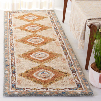 Elevate your space with our hand-tufted, round area rug, a symphony of rich browns and serene blues crafted in India. Made from a premium blend of 85% wool and 15% cotton, this 3' x 3' rug boasts a plush height of 1/2" for that luxurious underfoot feel. The pattern exudes the timeless allure of bohemian chic with its inviting diamond motifs and intricate border details. Each design element is thoughtfully presented in a round shape to create a harmonious focal point in any room. Perfect for those who appreciate artisanal elegance and worldly charm, this rug is an art piece for your floor, offering both comfort and style.