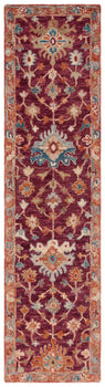 The rug's rich color palette centers around varying shades of red and pink, creating an alluring foundation that complements a variety of decors. The intricate pattern displayed on this runner showcases a harmonious blend of traditional motifs, including symmetrical designs and floral elements that add to its Bohemian charm.