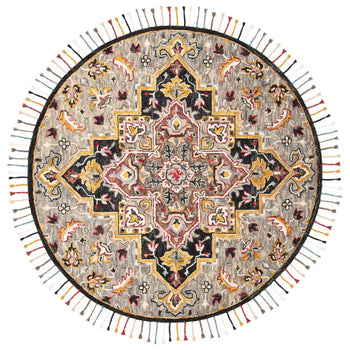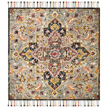 Adorned with an intricate pattern, this rug showcases a beautiful medley of charcoal and grey tones, complemented by pops of vibrant colors that bring the design to life. The central medallion draws the eye, framed by an array of floral and geometric motifs, while the playful fringe adds a touch of whimsy to the classic aesthetic.