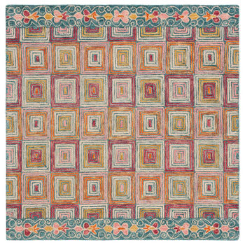 Drawing inspiration from Bohemian flair, the design features an eclectic mix of geometric patterns and playful floral motifs along the border, offering an eye-catching look that is both sophisticated and spirited. The sturdy construction promises durability and long-lasting beauty, ensuring this accent rug will be a treasured element of your home decor. Add a pop of color and pattern to your floor with this delightful handmade creation.