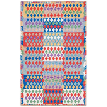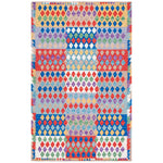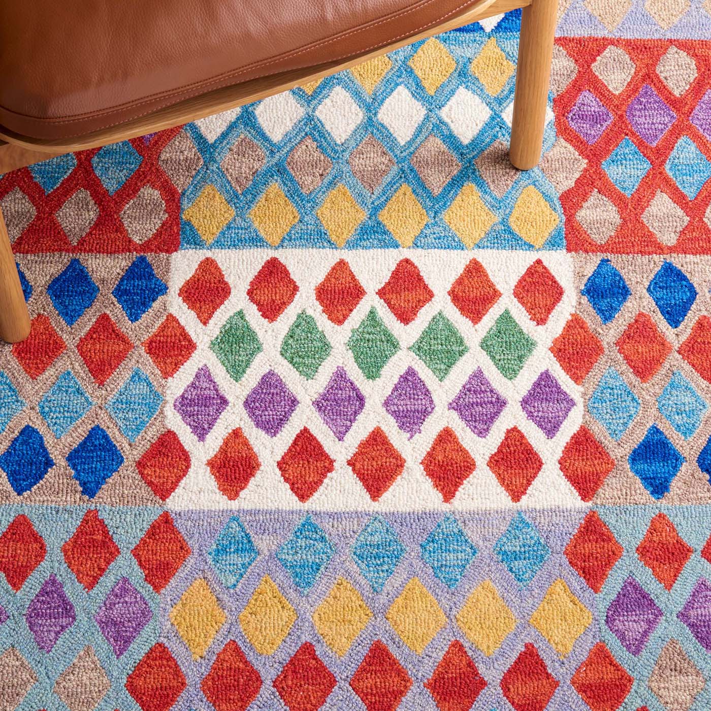 Designed and made in India, this runner exhibits a skillful hand-tufted technique, showcasing the artistry and expertise of local artisans. The rich, dynamic pattern features a harmonious mix of red and blue hues, adorned with geometric shapes and bold color blocks that create a tapestry of visual interest. Varied accents in complementary colors add depth and complexity to the design, inviting the eye to explore the intricate details.