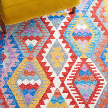 Introducing our exquisite Hand Tufted Runner Area Rug, a vibrant addition to any long and narrow space in need of a splash of color. This runner rug boasts a striking geometric pattern with a captivating blend of ivory and red as its primary color scheme, complemented by an array of cheerful hues that brighten up the entire design. Expertly crafted in India, the rug measures 2 feet 3 inches by 9 feet and features a comfortable pile height of 1/2 inch.