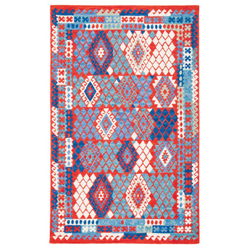 Introducing the vibrant and culturally rich hand-tufted runner rug, a perfect fusion of traditional craftsmanship and contemporary style. At a generous length of 9 feet and a width of 2 feet 3 inches, this runner is designed to elevate the aesthetics of your hallway, entryway or any long narrow space in your home or office. The rug features a captivating geometric pattern with an alluring blend of red and blue hues, offering an eye-catching accent for your floors.