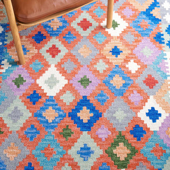 Illuminate your space with the vibrant charm of our Hand-Tufted Wool Runner Rug. Made in India, this stunning 2'-3" x 9' runner boasts a captivating kaleidoscope of orange and blue hues, meticulously crafted from 80% wool, 10% cotton, and 10% latex for long-lasting comfort and durability.