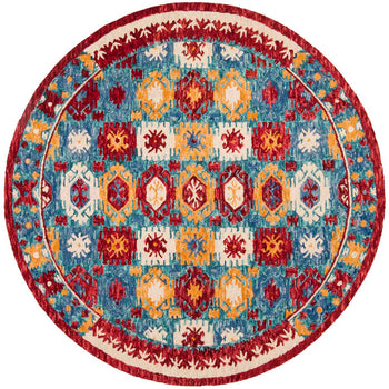 The rug's captivating design features a symphony of blue and red, interwoven with accents that bring each detail to life. As you glance at the pattern, you'll notice a harmonious blend of geometric and symbolic motifs, evoking a sense of classical beauty with a modern twist.