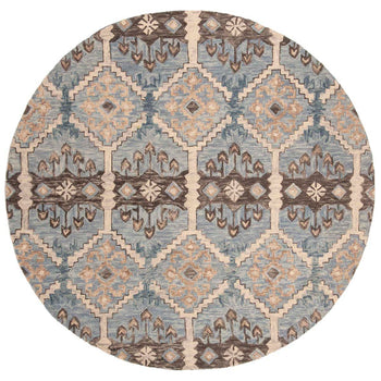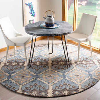 With its round silhouette measuring 3 feet in diameter, this rug is an ideal choice to add a touch of sophistication to smaller spaces or to serve as a focal point in a larger room. The rug's design, featuring an intricate and symmetrical blend of geometric shapes and delicate motifs, lends a classic yet contemporary charm to any interior setting.