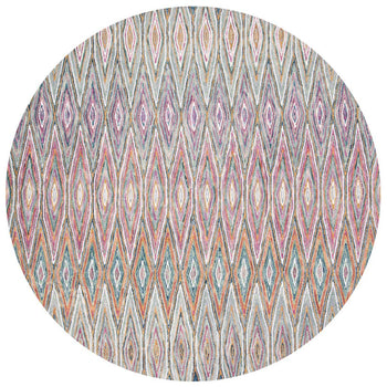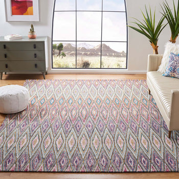Taking center stage is the rug's mesmerizing pattern, which is a harmonious fusion of vibrant colors and captivating geometric shapes. Rhythmic lines and eye-catching diamonds in shades of blue and pink dance across the surface, evoking the free-spirited essence of bohemian design. This sophisticated pattern will effortlessly complement your contemporary or eclectic decor while creating a focal point that captivates and intrigues.