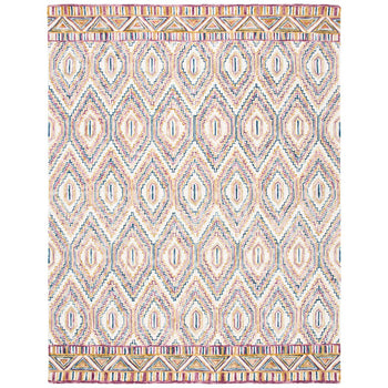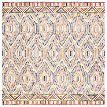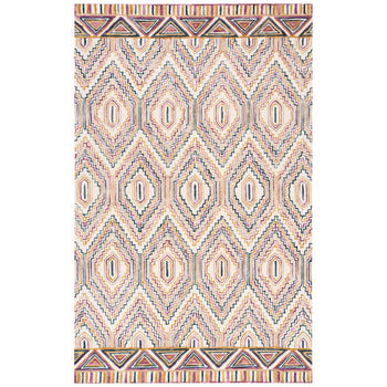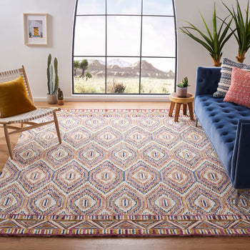 Admire the geometric patterns that dance across the surface, creating a vibrant and lively atmosphere in your home. The rug's motifs, which include diamond and zigzag shapes bordered by sophisticated linear details, infuse a touch of worldly sophistication into your decor.
