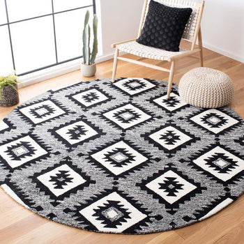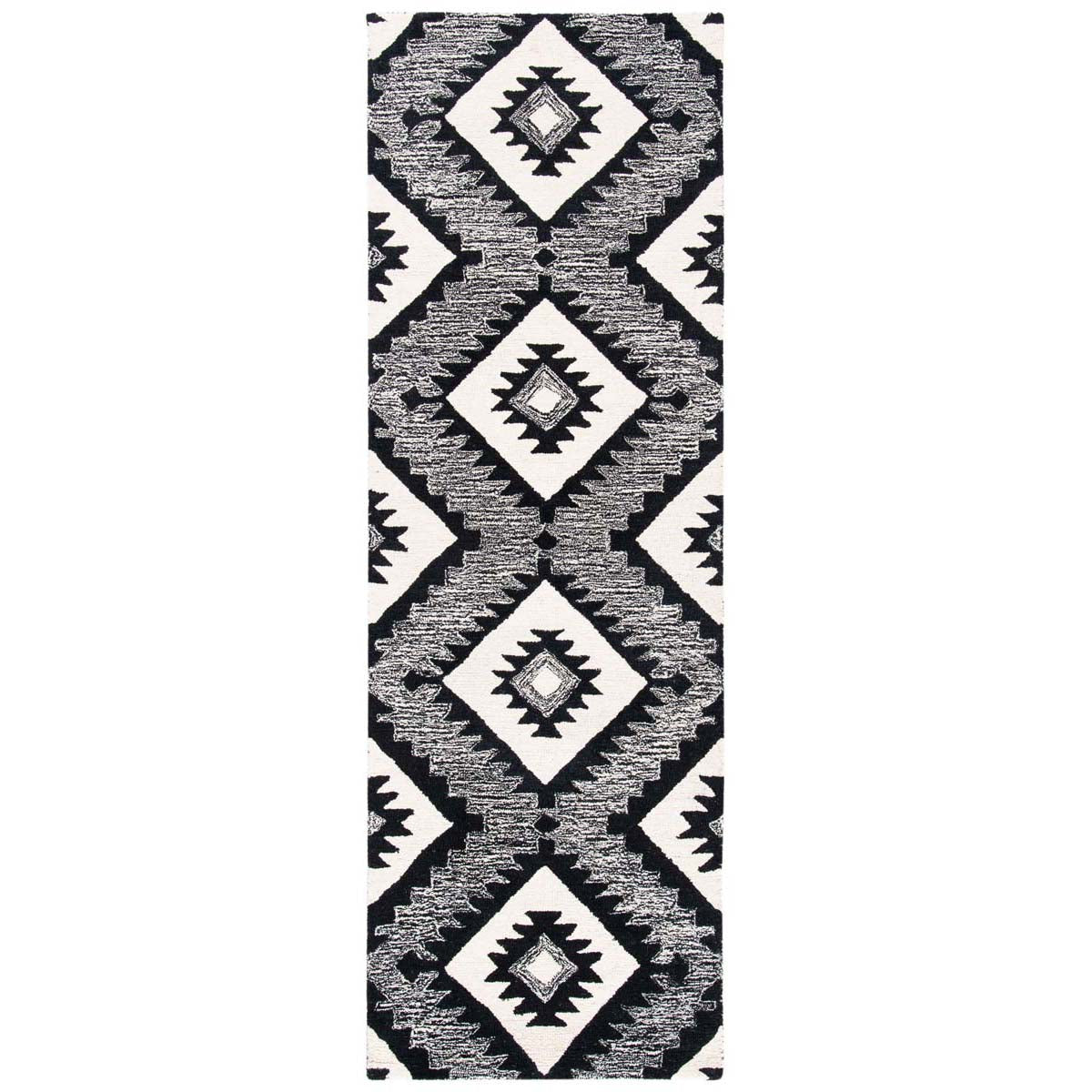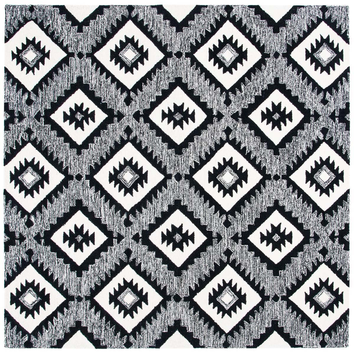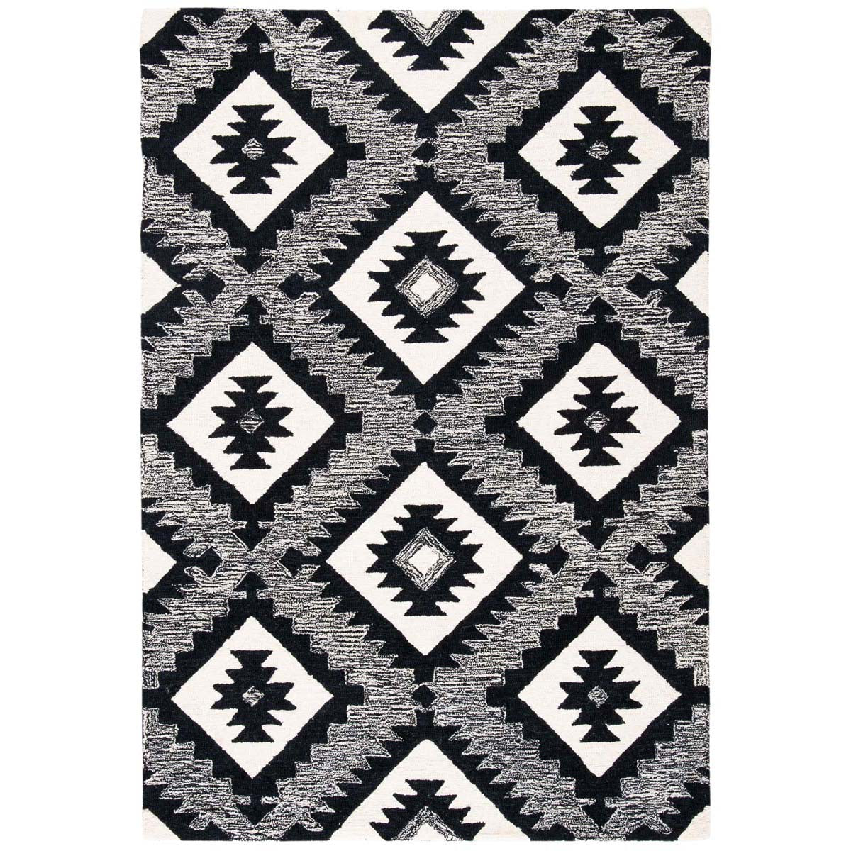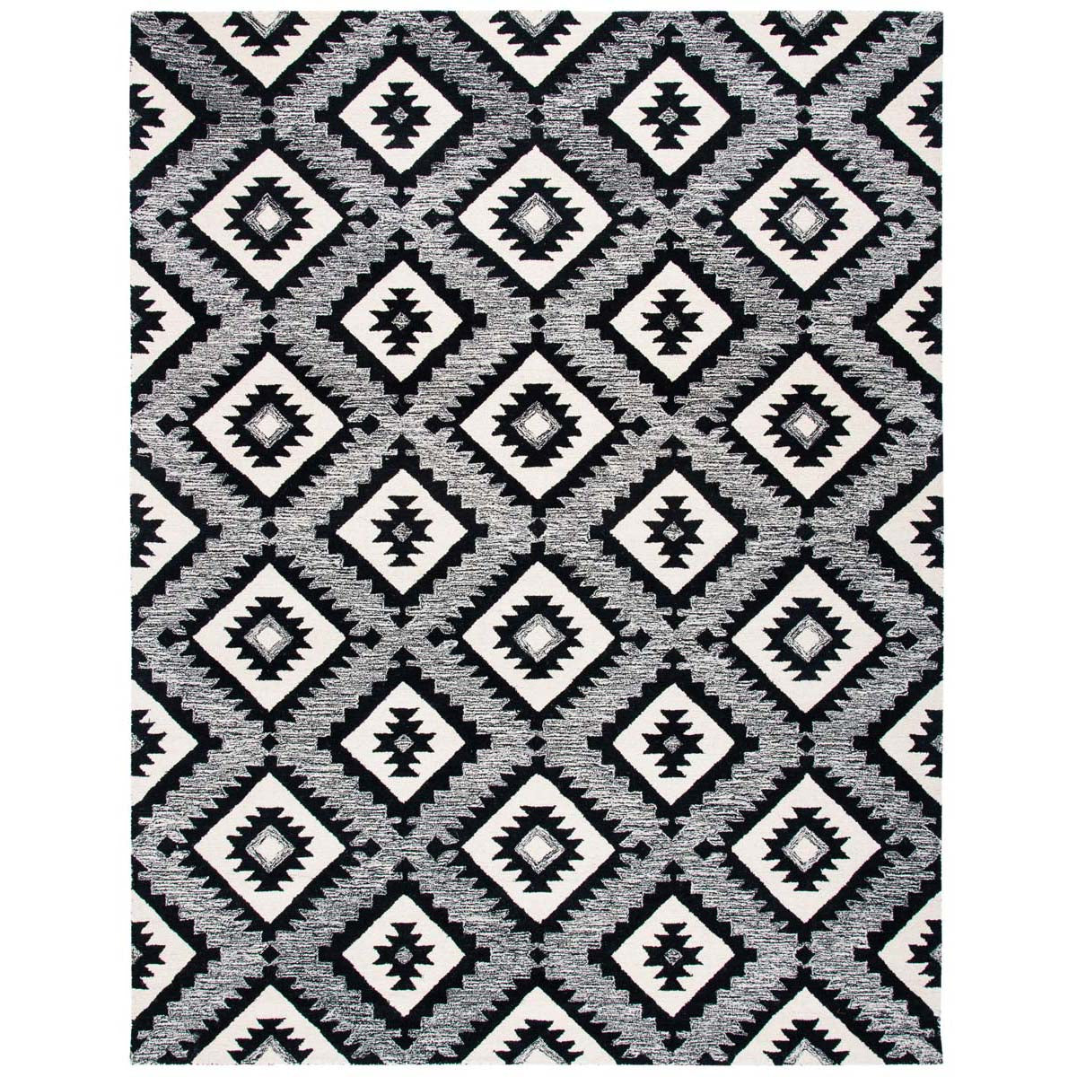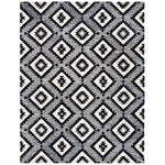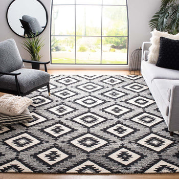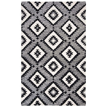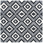 The design features a captivating pattern set in a bold charcoal and black color scheme, creating a stark contrast that will stand out in any room. Its geometric motifs offer a modern take on tribal-inspired elements, making it a statement piece that can complement various decor styles from contemporary to eclectic.
