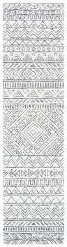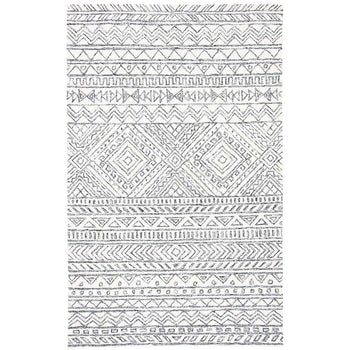 The rug features a captivating array of geometric shapes and tribal patterns, set against an ivory backdrop with striking black accents. The meticulously handcrafted design reflects the rug's traditional bohemian roots while seamlessly integrating into modern aesthetics.
