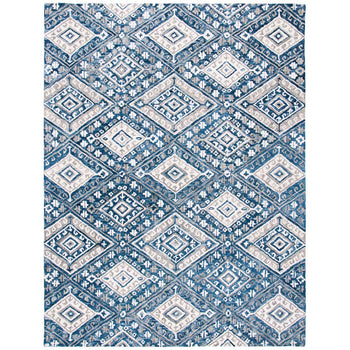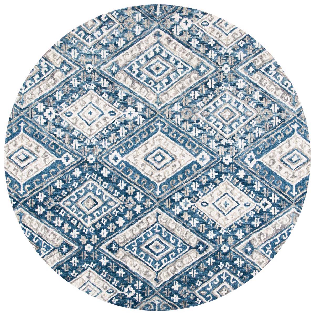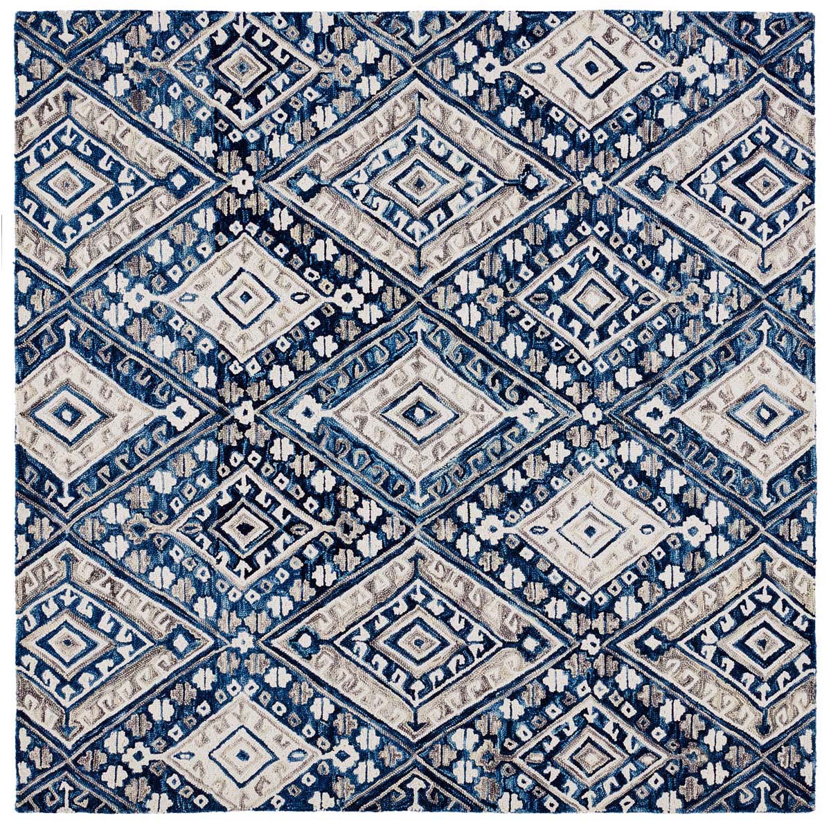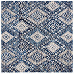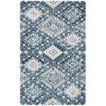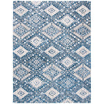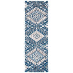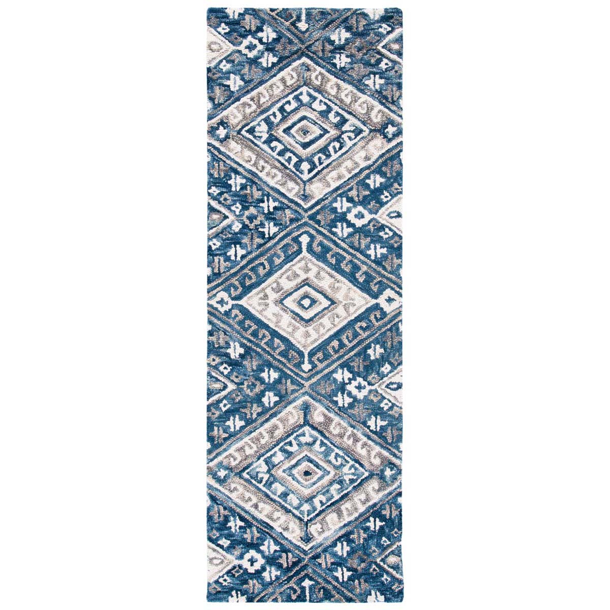 This runner?s charismatic Bohemian style is accentuated by its intricate pattern, showcasing a harmonious blend of bold geometric designs and traditional motifs. Its stunning design features a dynamic array of diamond shapes and abstract symbols, exuding a sense of history and artistry that revives and complements any interior d?cor. The rug's grey foundation is adorned with ivory accents, gracefully framed by varied shades of blue, culminating in an arresting visual narrative that adds depth and texture.
