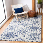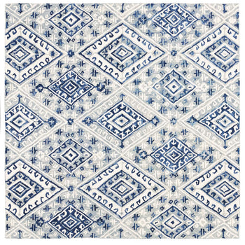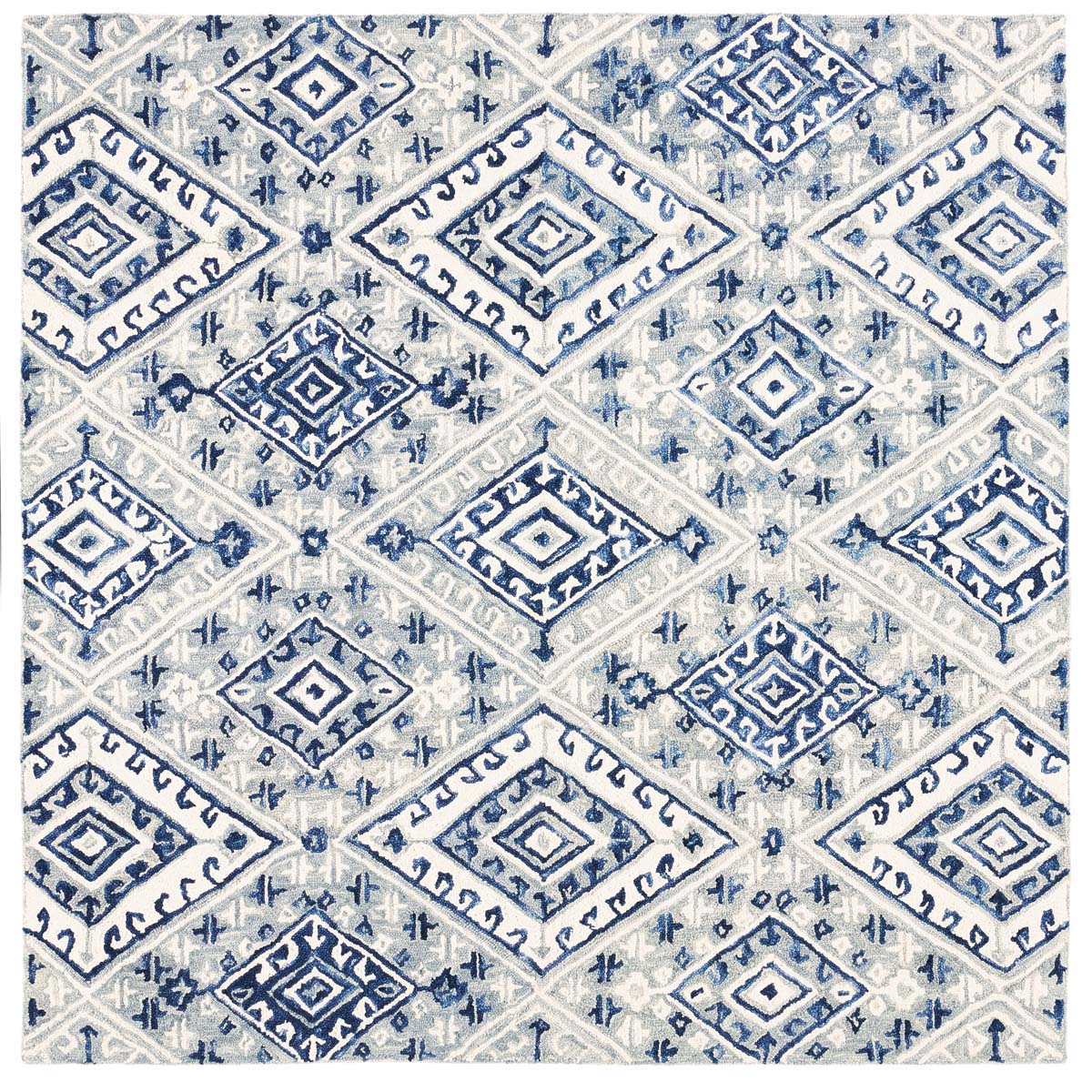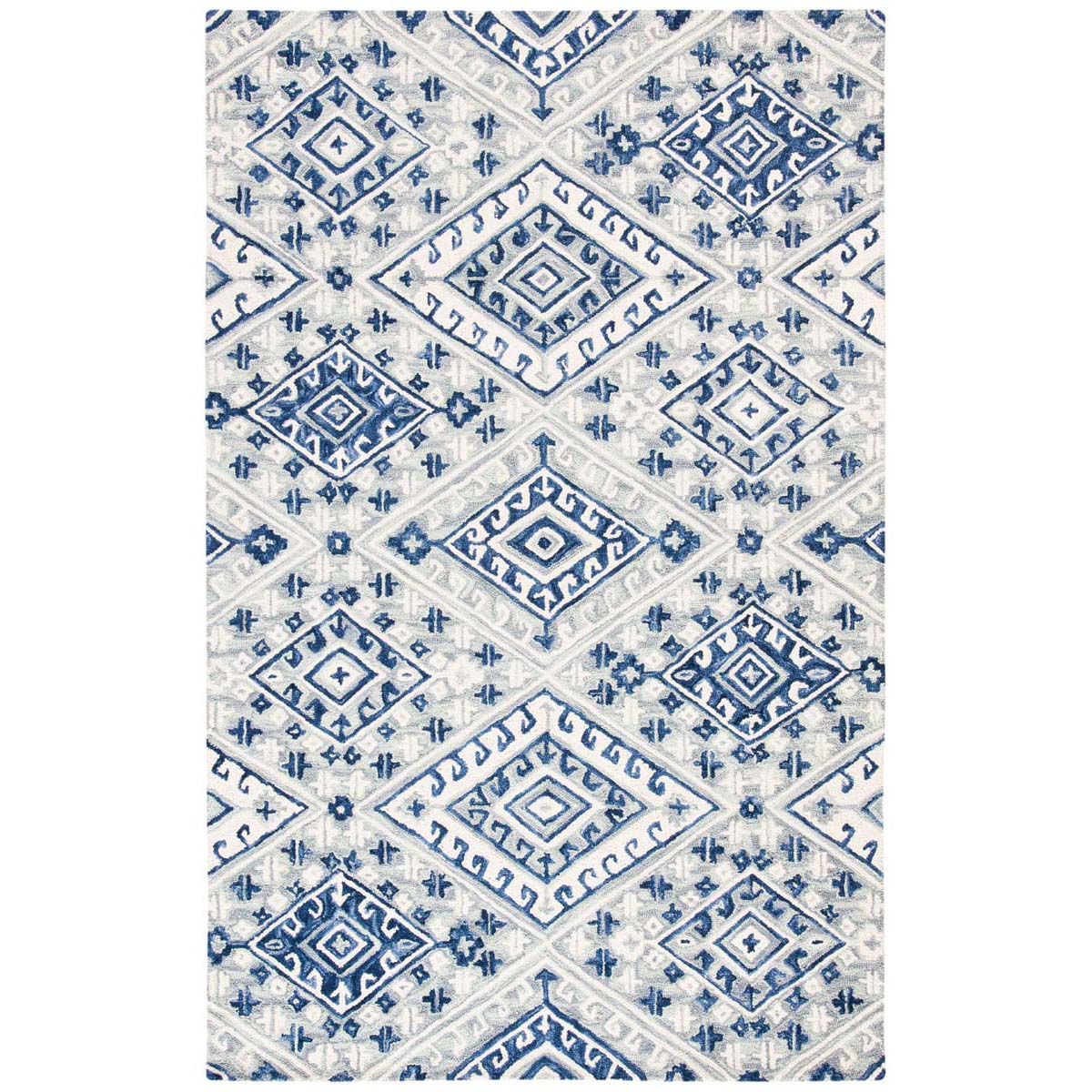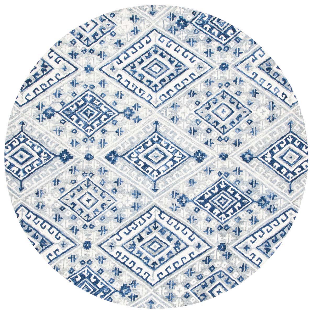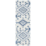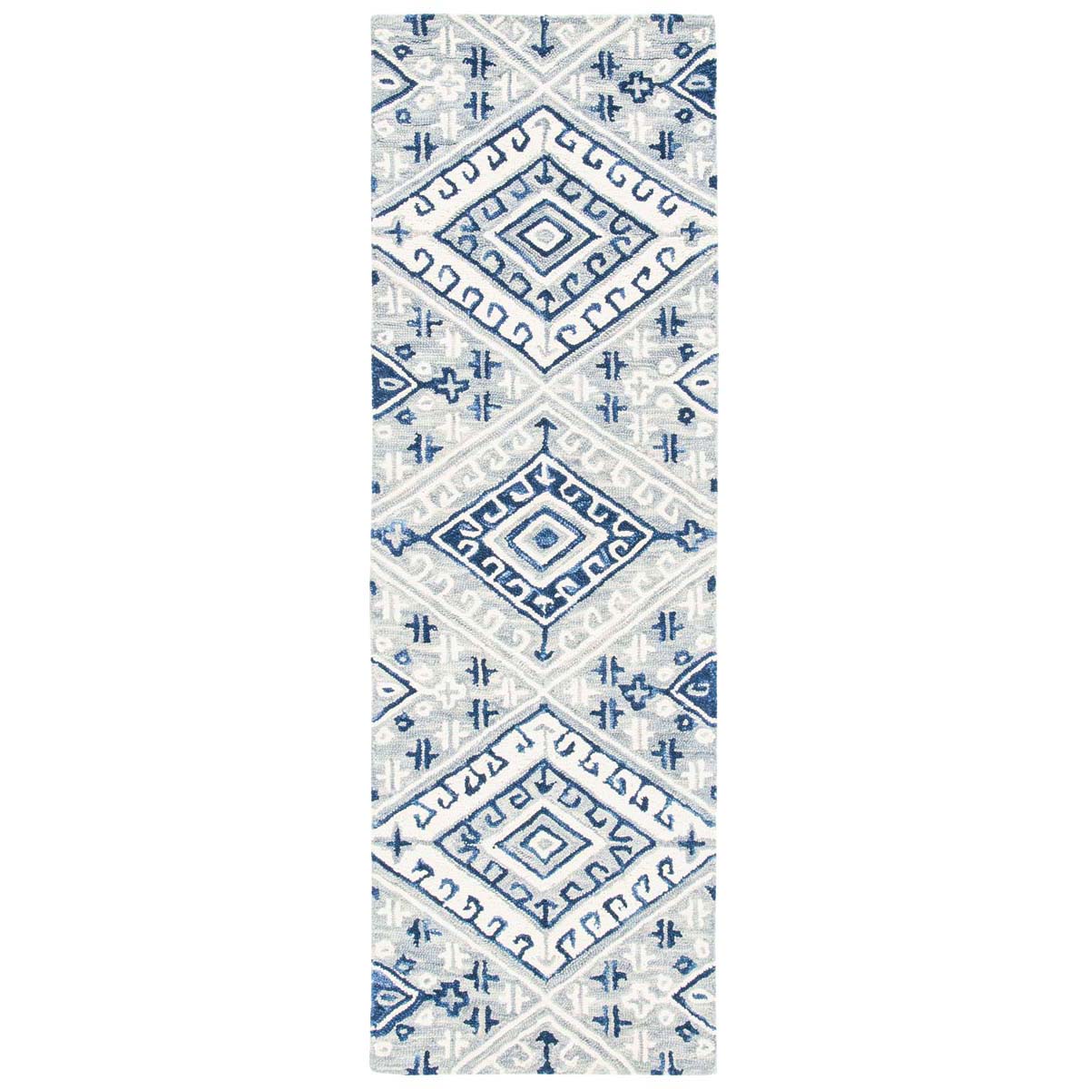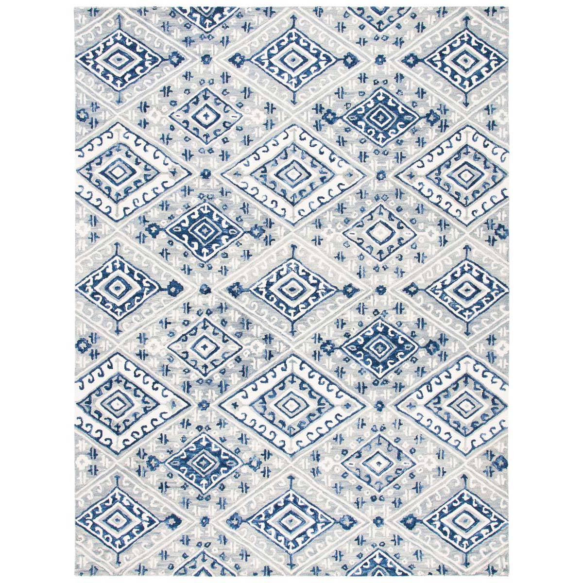 The captivating design features a harmonious blend of grey and navy hues, creating an enchanting geometric pattern that will infuse a touch of elegance and wanderlust into your living space. Each line and shape in the rug's pattern speaks of meticulous attention to detail, with symbols and motifs that suggest a narrative waiting to be unveiled, evoking tales of faraway lands and ancient folklore.