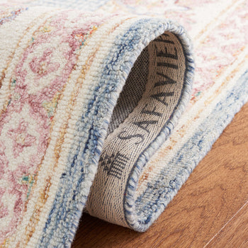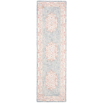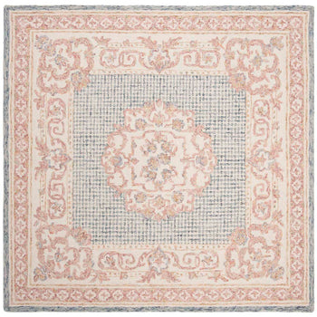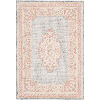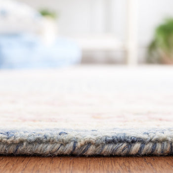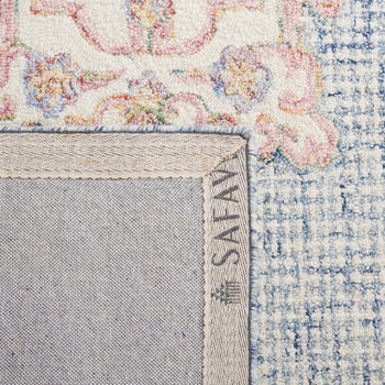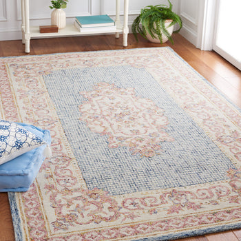 Showcasing a timeless design, the area rug blooms with an elegant blue and ivory color scheme that echoes both classic charm and contemporary grace. The understated blue backdrop is artfully contrasted with ivory accents, culminating in a central medallion and an ornate border adorned with delicate floral motifs and intricate scrollwork. Each detail is thoughtfully hand-tufted by skilled artisans in India, ensuring that every piece is as unique as it is beautiful.