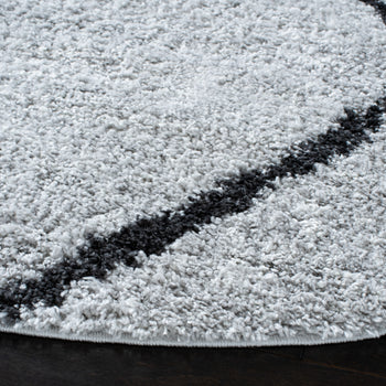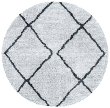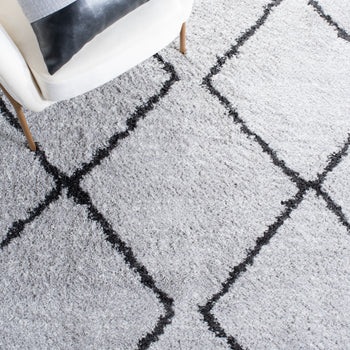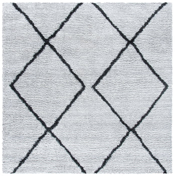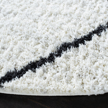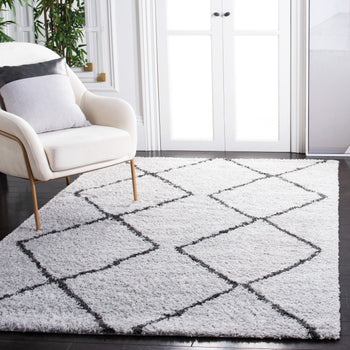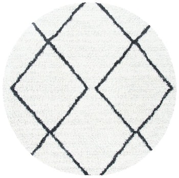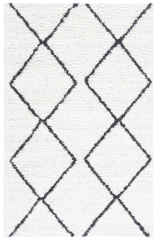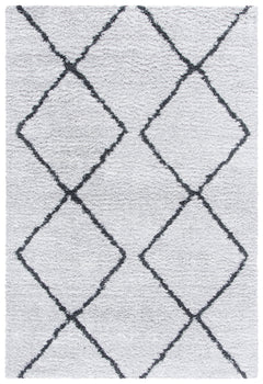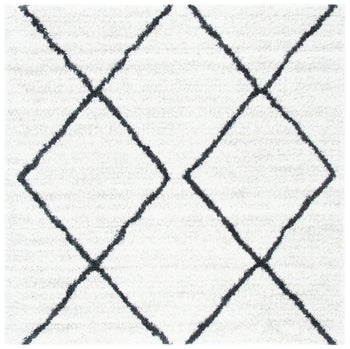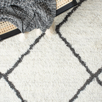 Embracing the much-loved Shag style, the rug's design features a crisp ivory base with a striking geometric diamond pattern that exudes a simple yet bold aesthetic, versatile enough to complement both contemporary and traditional decors.