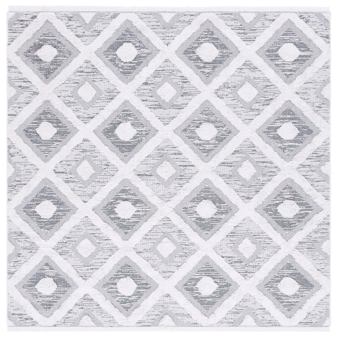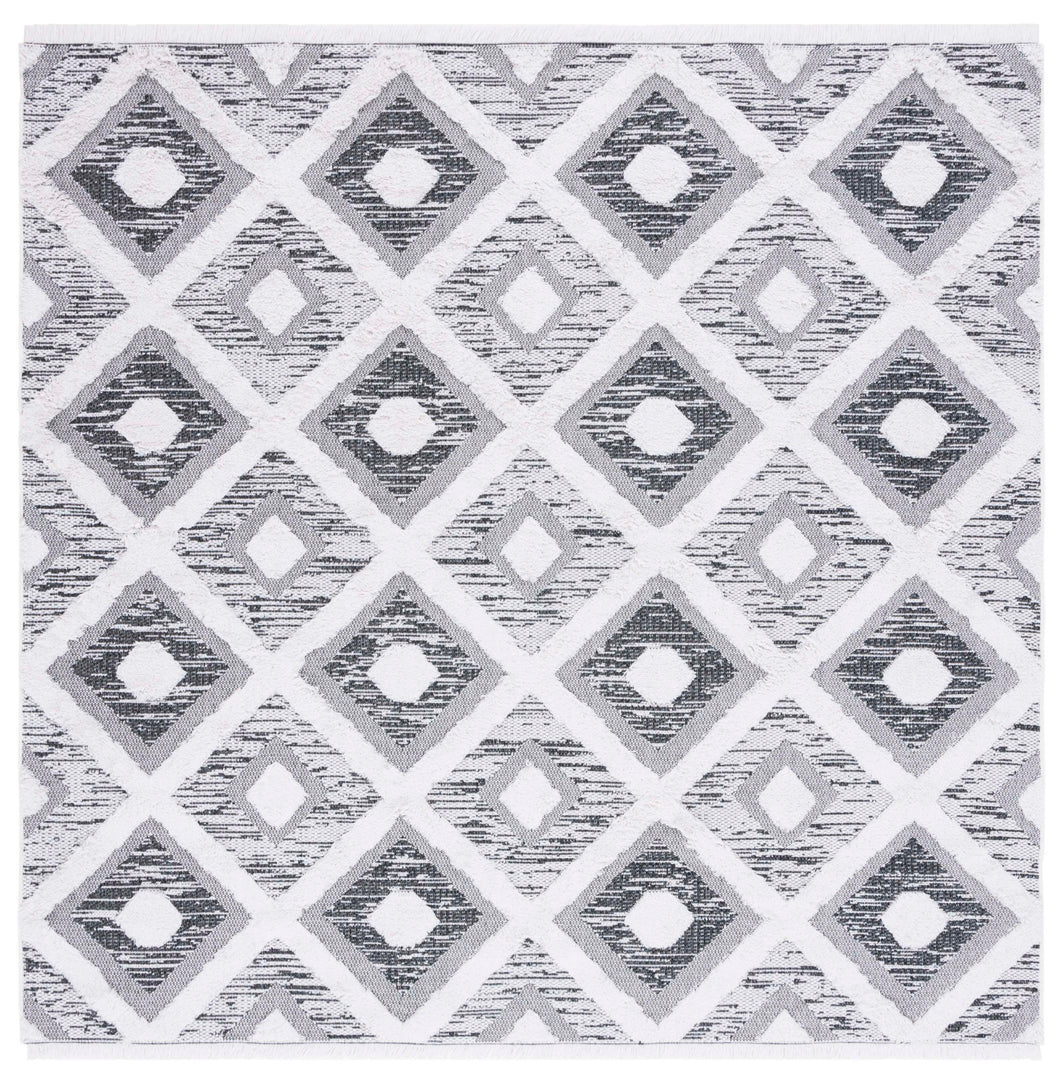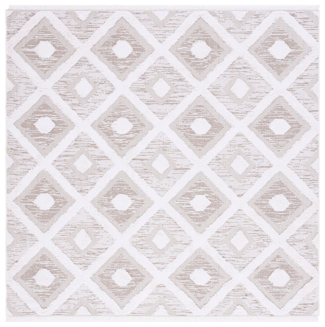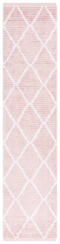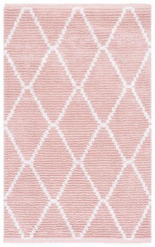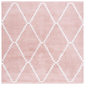 The rug's design features a timeless pattern with diamond shapes that bring a sense of classic sophistication to your space. The crisp geometric lines in ivory stand out against the soft pink background, offering a contemporary take on a traditional pattern.