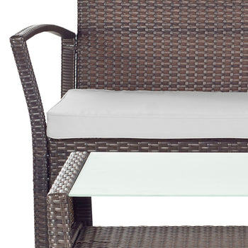 Crisp and contemporary, the Avaron 4 Piece Outdoor Set has a European designer look that will dress up your patio in style. Crafted to withstand the elements in sturdy dark brown rattan with waterproof Terylene upholstery fabric, the Avaron set includes loveseat, two arm chairs and a coffee table, the ideal conversation seating group for gracious outdoor living.