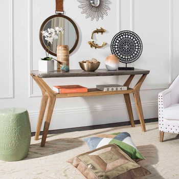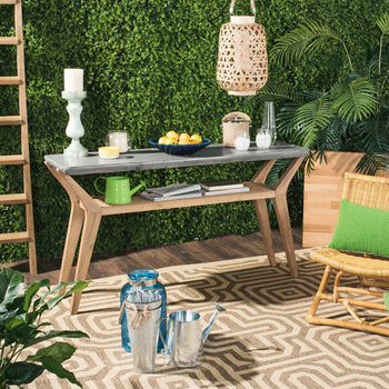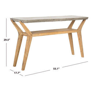 Sleek and sophisticated, this contemporary concrete indoor outdoor console is perfect for the modern living room, foyer or outdoor entertaining area. Designers love its dark grey concrete top, natural acacia wood and storage shelf.