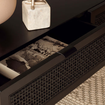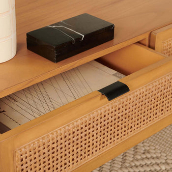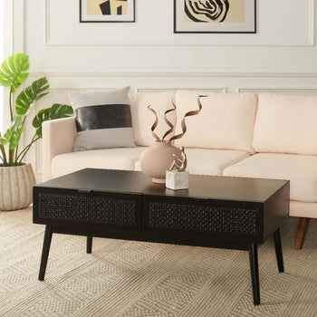 Embrace the breezy style and high-functionality of our Baisley coffee table. Its clean-lined and modern tabletop is enriched with lively grains of wood. Elevated upon bold and beautiful tapered legs, our coffee table attains a light and airy presence. Its breezy look is enhanced with rattan webbing upon its facade. Our charming and inviting coffee table features two drawers to keep all your small knick-knacks organized to offer a dose of style and convenience to your home.