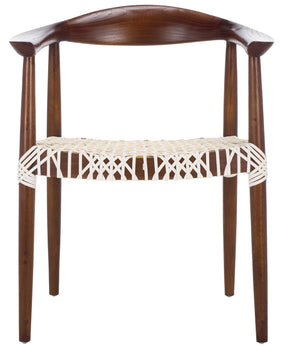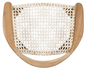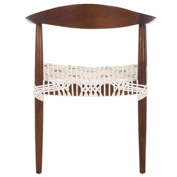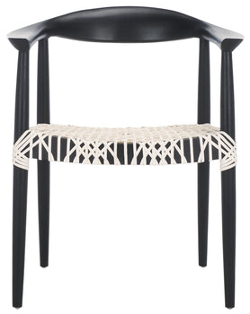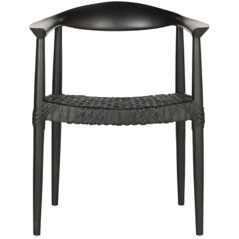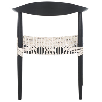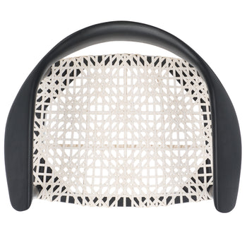 Reminiscent of Mid Century Modern chairs with black wood and spindle legs, the retro chic Bandelier armchair is updated with intricate woven seat in a contemporary black laced web effect. Made from reclaimed teak, this transitional chair adds character to the living room, family room or perhaps a pair facing a desk.