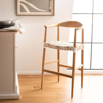 This Bandelier Bar Stool highlights all the best of contemporary design: clean lines, subtle curves, and stunning designer details. Bandelier gives any decor a trendsetting aesthetic with its woven white leather seat in a geometric lattice, beautifully offsetting its smoothly curved natural teak frame.