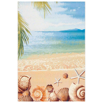 The majesty of the sea comes alive with the rug's calming pattern, showcasing a harmonious blend of golden hues and deep blues that mimic the ocean's vastness and the warmth of sandy shores. Decorative elements like seashells and coastal flora are intricately woven into the design, creating an immersive beachfront experience indoors or out.