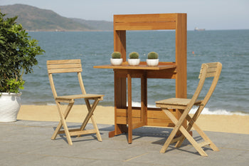 Quaint, casual and convenient for spaces large or small, the Barley Flower Shelf 3 PC Bistro Set transforms leisure living spaces into outdoor getaways. Easy setup, easy fold away storage, the Barley Bistro set comes with matching wooden chairs and a handy table shelf, made from teak and eucalyptus.