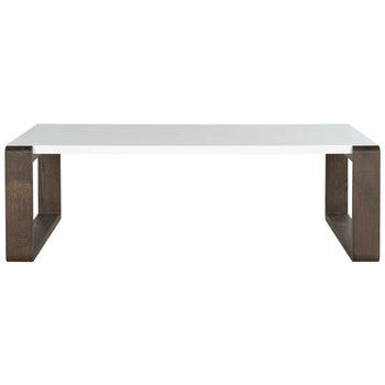 Rugged meets refined in the contemporary Bartholomew coffee table with white lacquer top and chunky wood grained base in a chic dark brown finish. In homes from coastal to urban, this dramatic console will command attention in a living room or den.