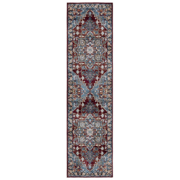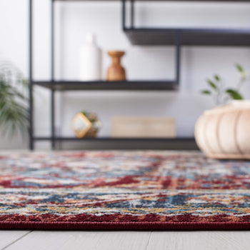 The slender profile of the rug, with its 1/8" height, enables it to elegantly hug the floor, making it a seamless addition to both high traffic areas and intimate spaces. The beautiful interplay of rich blues and vibrant reds unfolds in a traditional pattern that draws inspiration from classic designs, adding a touch of elegance and warmth to any room.