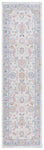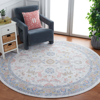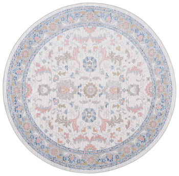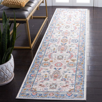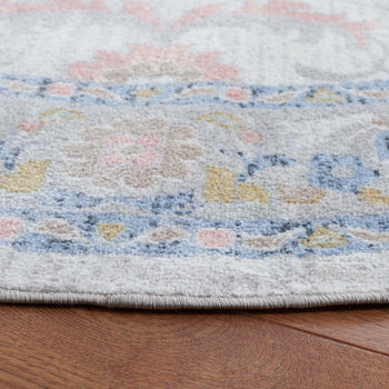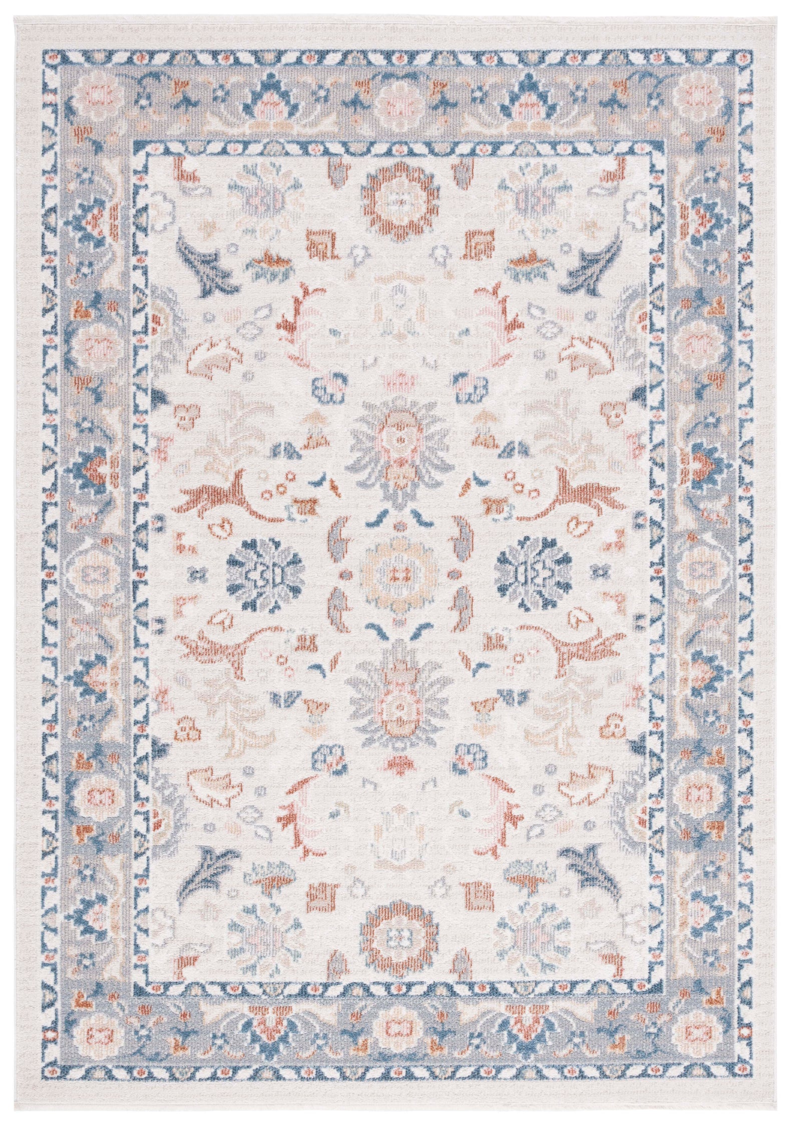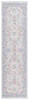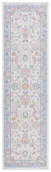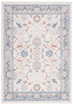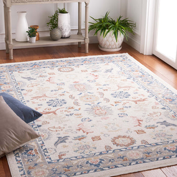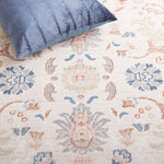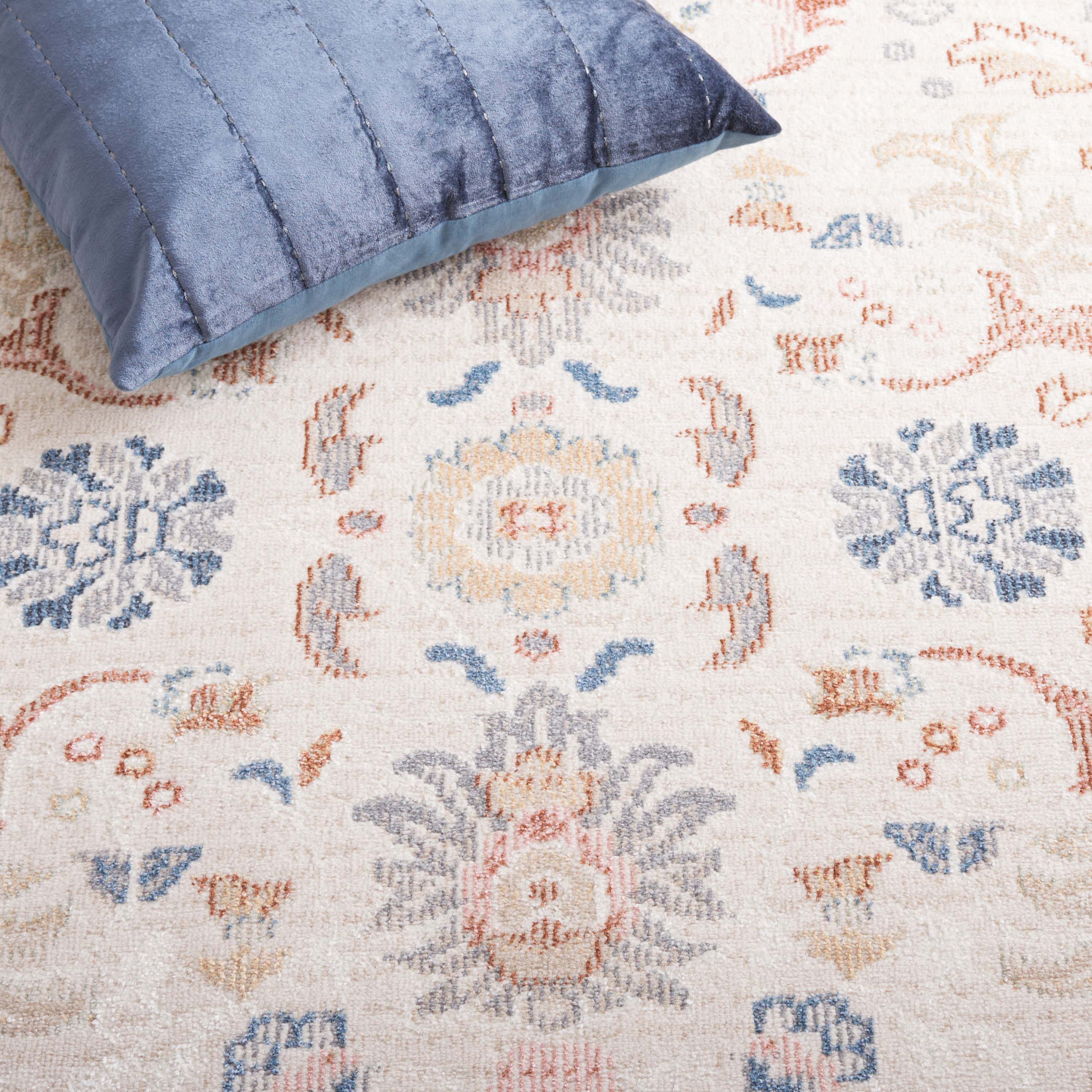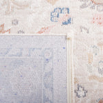 The timeless appeal of the rug is accentuated by its charming traditional pattern, boasting intricate florals and ornamental motifs spread elegantly across a creamy beige canvas, bordered by detailed bands that tell a story of artisanal heritage. The captivating blue accents intermingled with subtle hints of pink, gold, and grey create a serene and inviting ambiance, perfect for both contemporary and classical interiors.