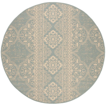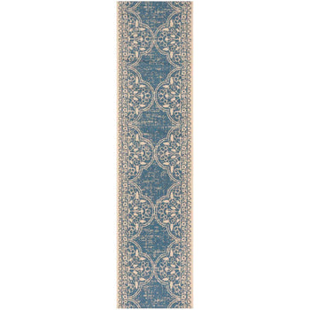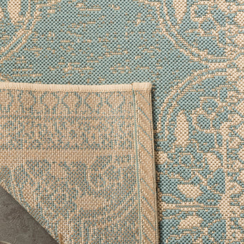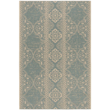 Introducing our exquisite accent area rug, a lovely addition to both indoor and outdoor settings, fashioned in the serene shades of aqua and cream. Measuring a versatile 2'-2" X 4' and crafted with a low-profile 1/4" pile height, this piece offers both comfort and ease of maintenance.