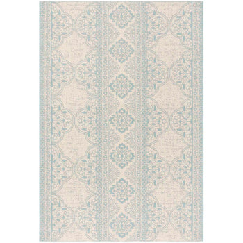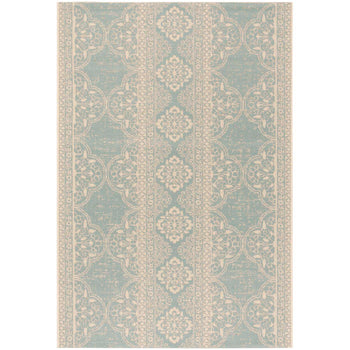 The rug's pattern, drawn from the detailed image provided, showcases a harmonious balance of classic motifs and border details, imbuing your space with a timeless elegance. The soft aqua tones create a tranquil ambiance, while the cream accents highlight the sophistication of the design.
